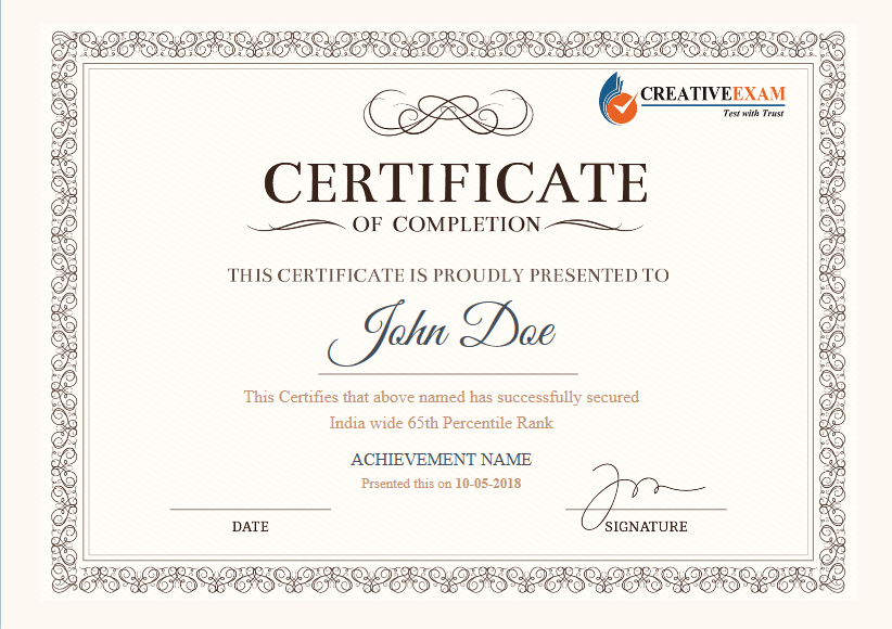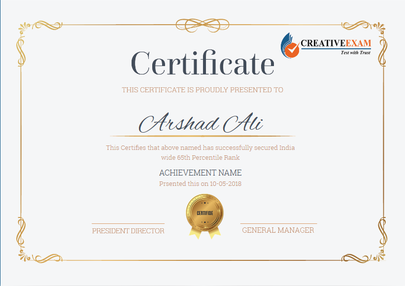 This Certifies that above named has successfully secured India wide 65th Percentile Rank